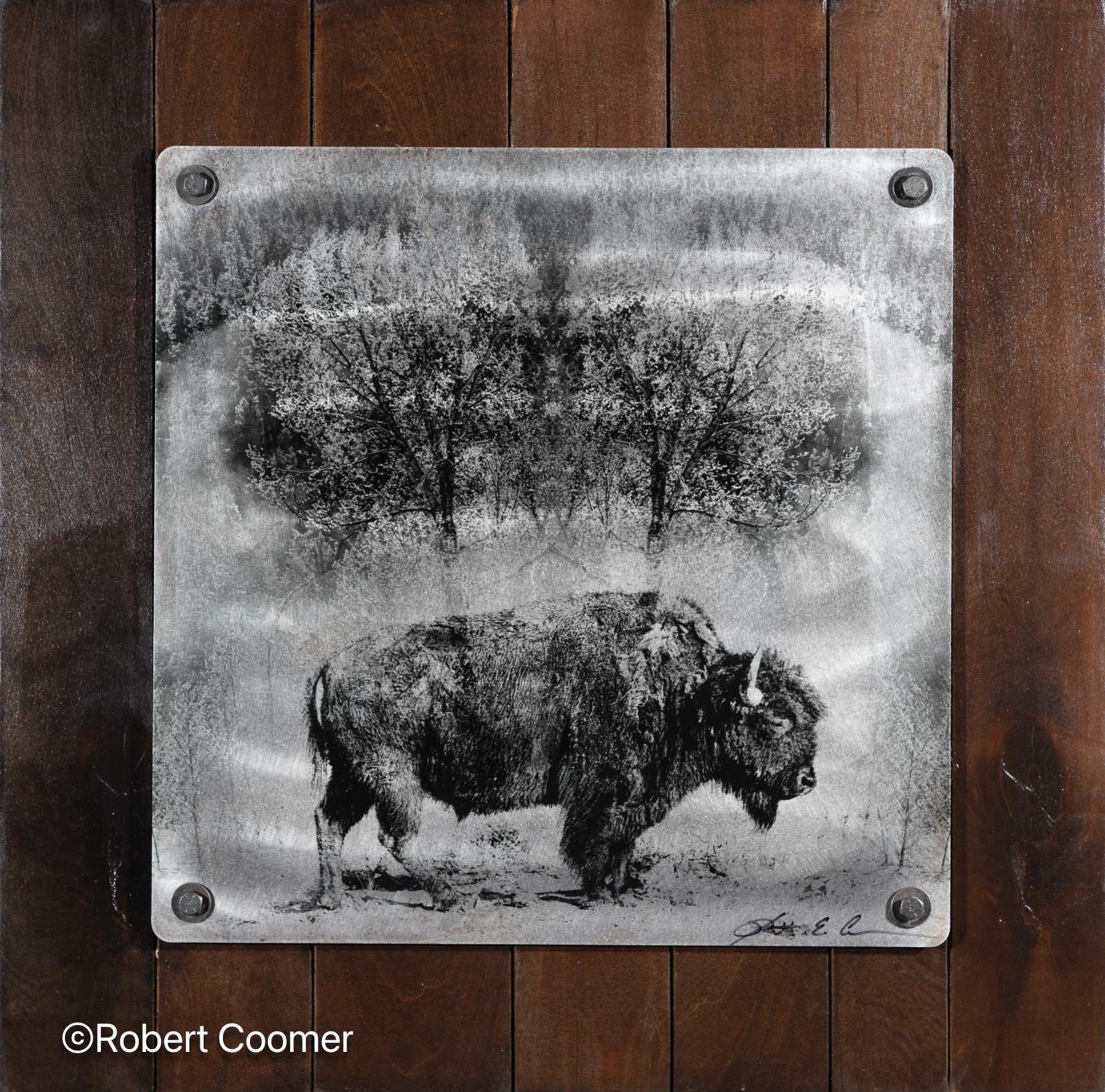 Robert Coomer - Robert Coomer is an internationally recognized, award winning photographer who grew up on a farm in Brown County, Ohio. Art has always been a part of his life and in 1994 he graduated with a BS degree in Graphic Design from the University of Cincinnati College of Design, Art, Architecture, and Planning. He draws from his farm roots to shoot images of backyard wildlife, old barns, farmscapes, and scenic landscapes in Southwestern Ohio and Eastern Kentucky. His work is an exploration of light and subject, and discovering beauty in unexpected places. I find beauty in age and decay, and then reproduce it in a way that maintains a sense of time and place. To do this, I use distressed steel as the basis of my pieces. It can take up to 3 months to build up the rust and patina patterns on each piece of steel and then up to 12 hours of surface work to strip and reveal the damage done. Once I have my surface, the image is printed to the metal with various techniques, and then float mounted on stained wood using distressed bolts that maintain the aged and worn appearance. Through this process I am able to create an emotional connection to the image, and produce a piece authentic enough to look as though it had been stolen from the scene and presented to the viewer as an artifact on display. The work is modern and industrial, but is equally at home among antiques and more traditional settings.